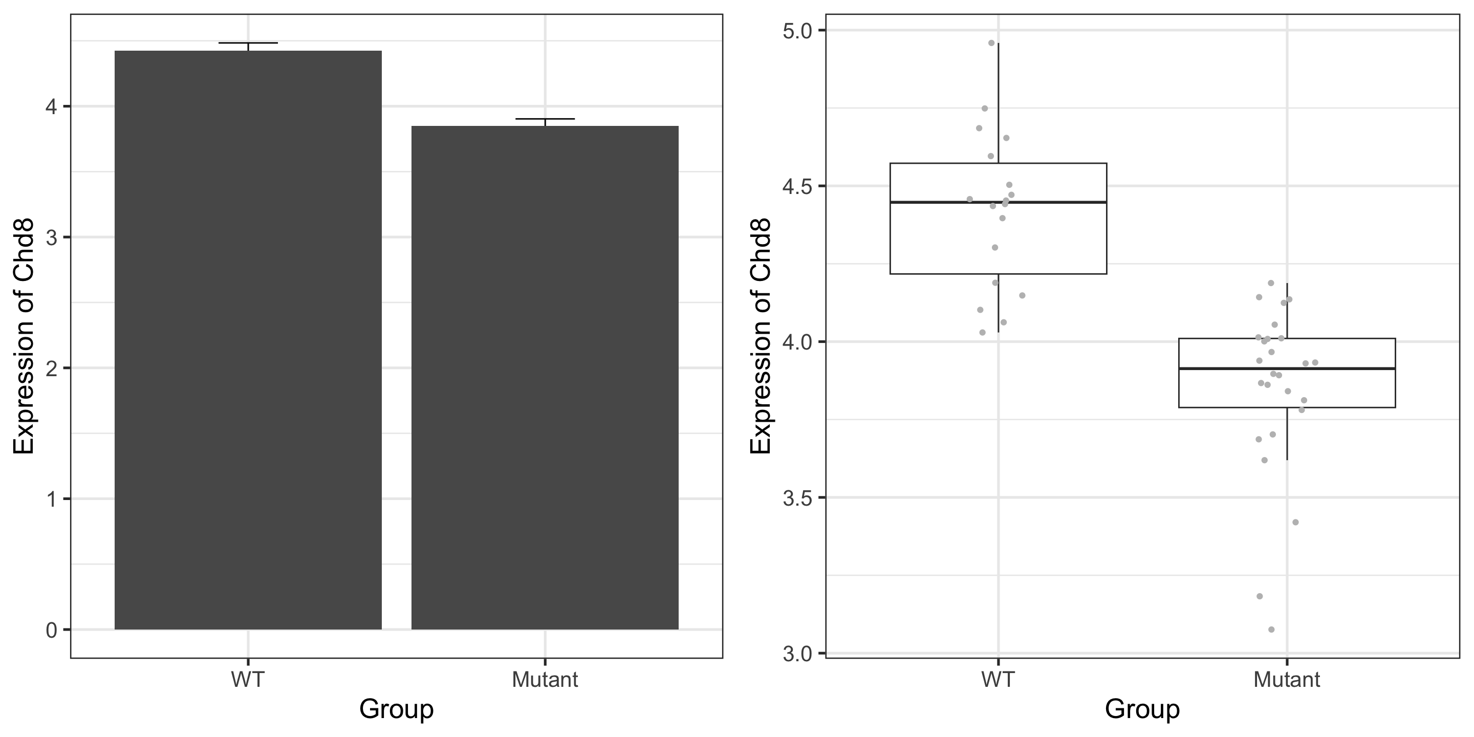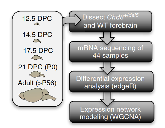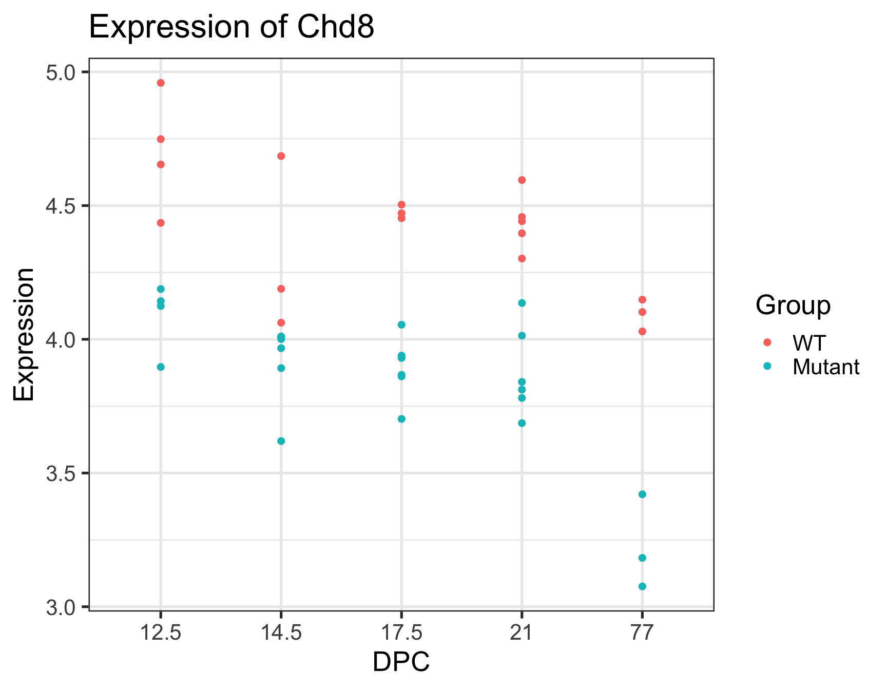 E keyCTRL/CMD+PGompers et al. (Nature Neuroscience 2017) performed RNA-seq on mice from two different genotypes (18 WT vs 26 CHD8 mutant) and 5 developmental stages