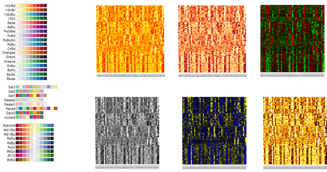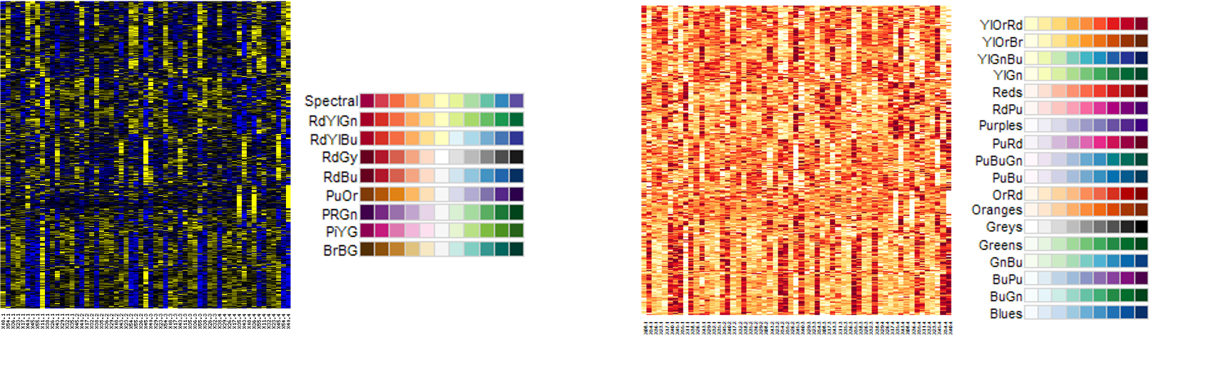 RColorBrewer: scales based on work of visualization expertsDivergent: colours pass through black or white at the midpoint (e.g. mean). Ideal if your original data are naturally “symmetric” around zero (or some other value) - Otherwise it might just be confusing