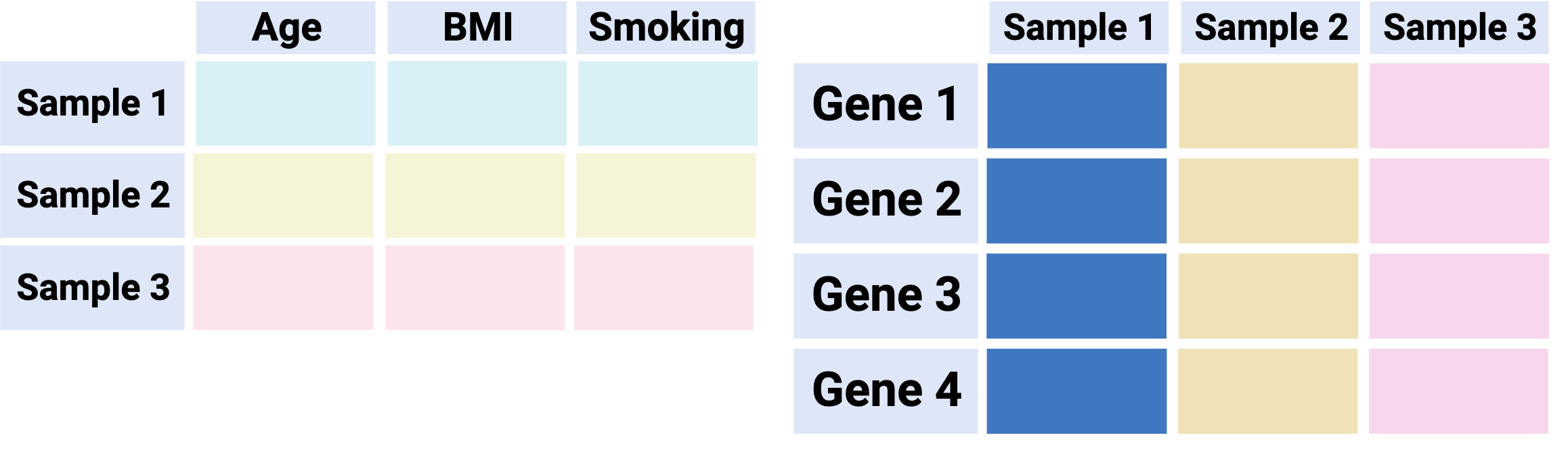Metadata file: several covariates/experimental design variables for each sample ( \(N\) samples \(\times\) \(P\) covariates)