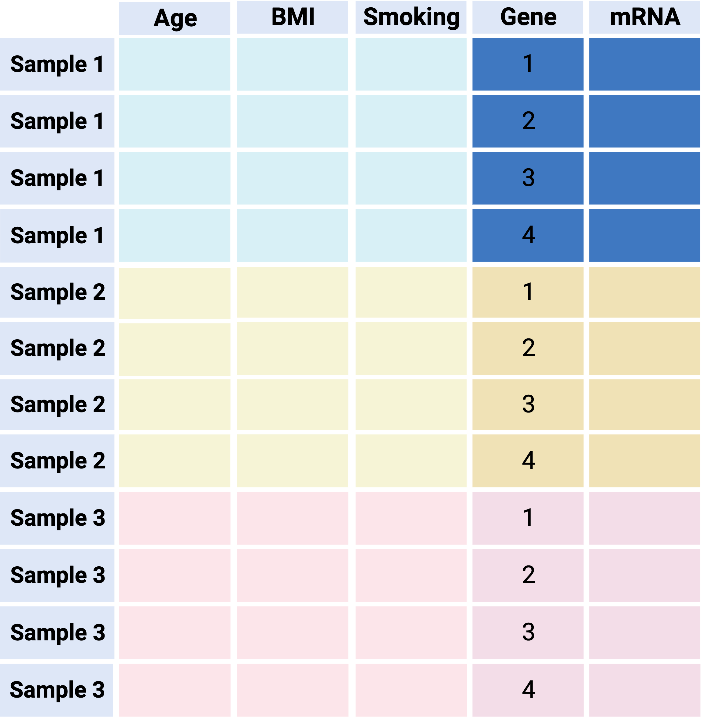 Main data file: expression values - one per gene, per sample ( \(G\) genes \(\times\) \(N\) samples)