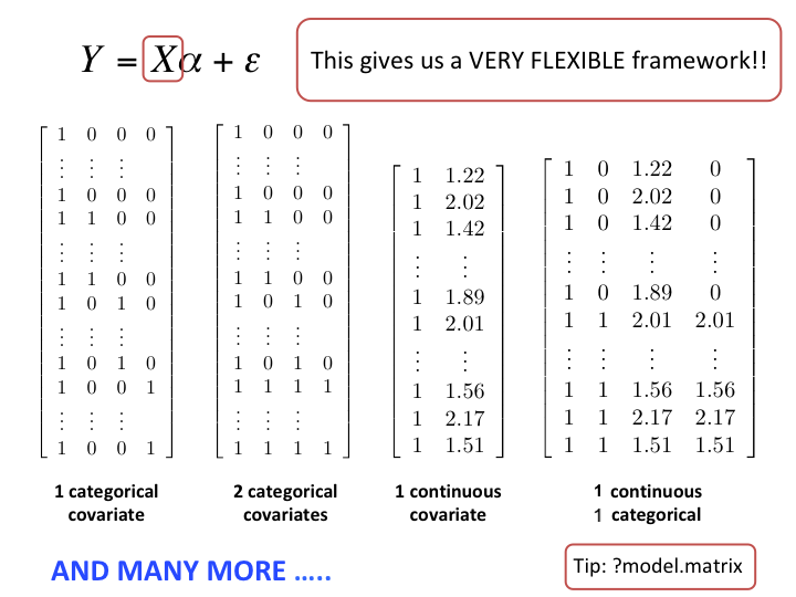 We can write a linear model using matrix notation: \(Y = X \alpha + \varepsilon\)