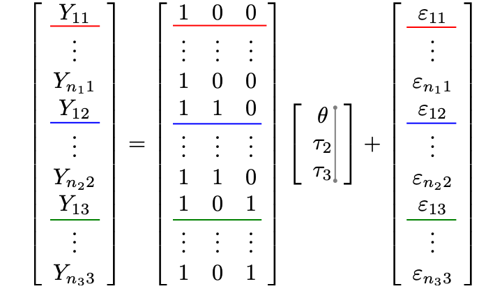 \[Y_{ij} = \theta+\tau x_{ij} + \varepsilon_{ij}\;\text{where}\; \; x_{ij}=\bigg\{\begin{array}{l}