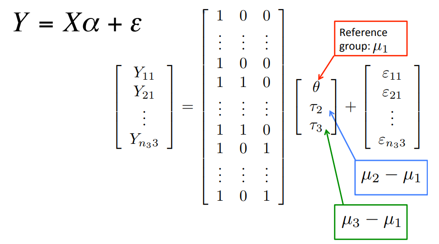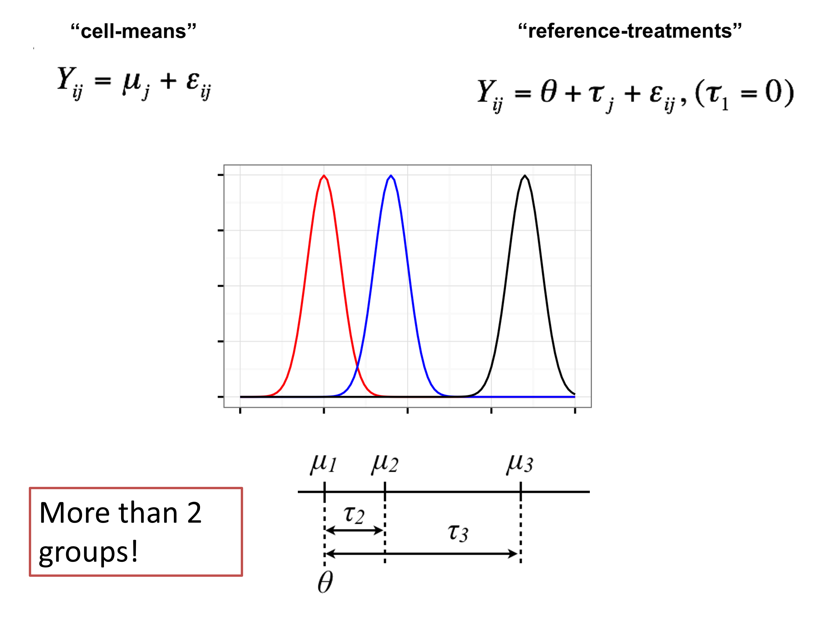 1-way ANOVA with many levels1 using a linear model - e.g for 3 groups: \[Y_{ij} = \theta+\tau_2 x_{ij2} + \tau_3 x_{ij3} +\varepsilon_{ij}\;\; \text{where} \; x_{ij2}=\bigg\{\begin{array}{l}