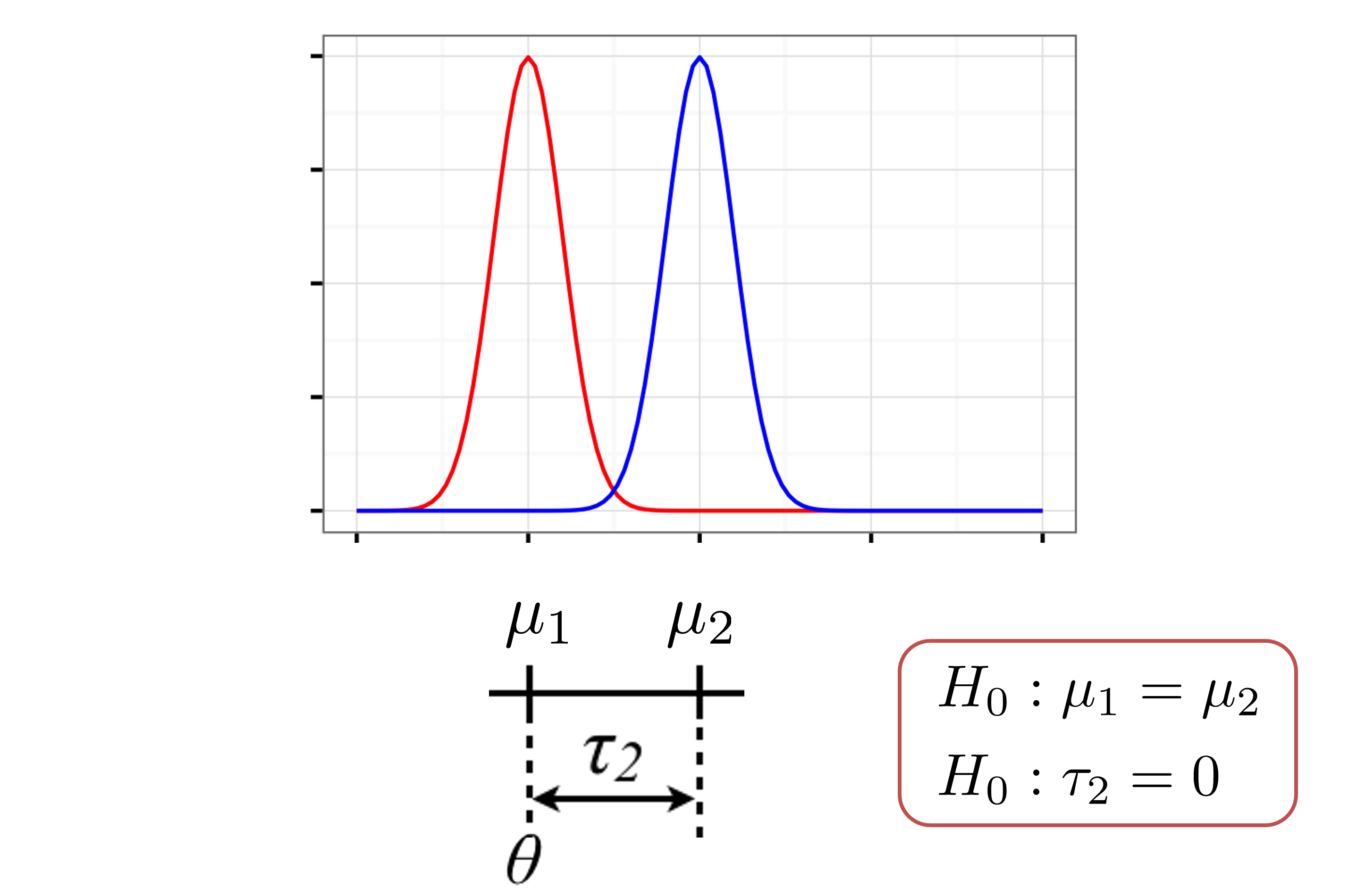 Note that for each group, the population mean is given by \(E[Y_{ij}] = \theta+\tau_j=\mu_j,\) and \(\tau_2=\mu_2-\mu_1=E[Y_{i2}] -E[Y_{i1}]\)compares the means