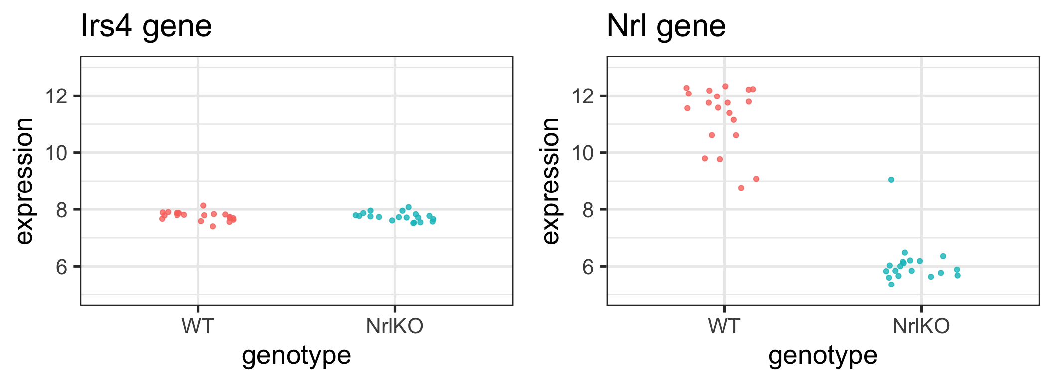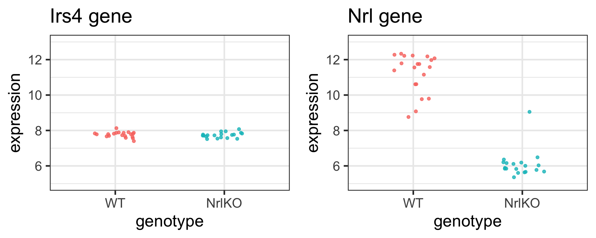 where \(j\) indexes groups (e.g. WT vs NrlKO) and \(i\) indexes samples within group, the goal is to test \(H_0 : \mu_1 = \mu_2\)