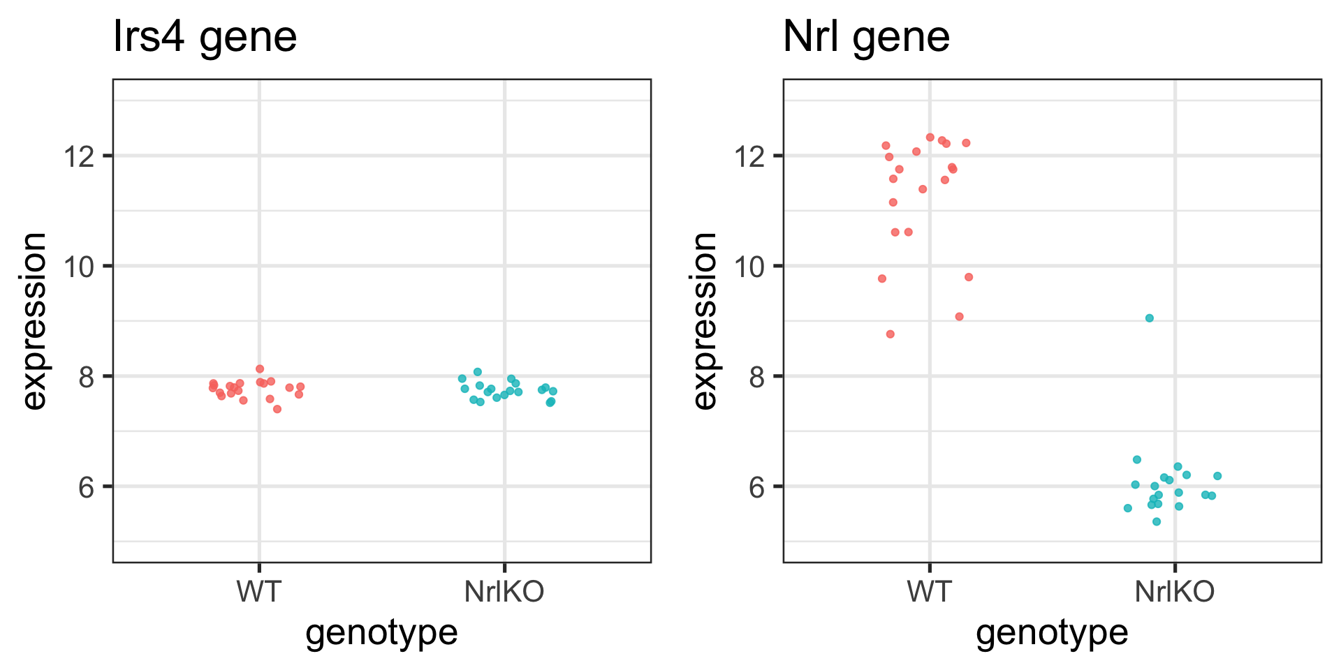 filter(twoGenes, gene =="Irs4") %>%lm(expression ~ genotype, data = .) %>%summary()